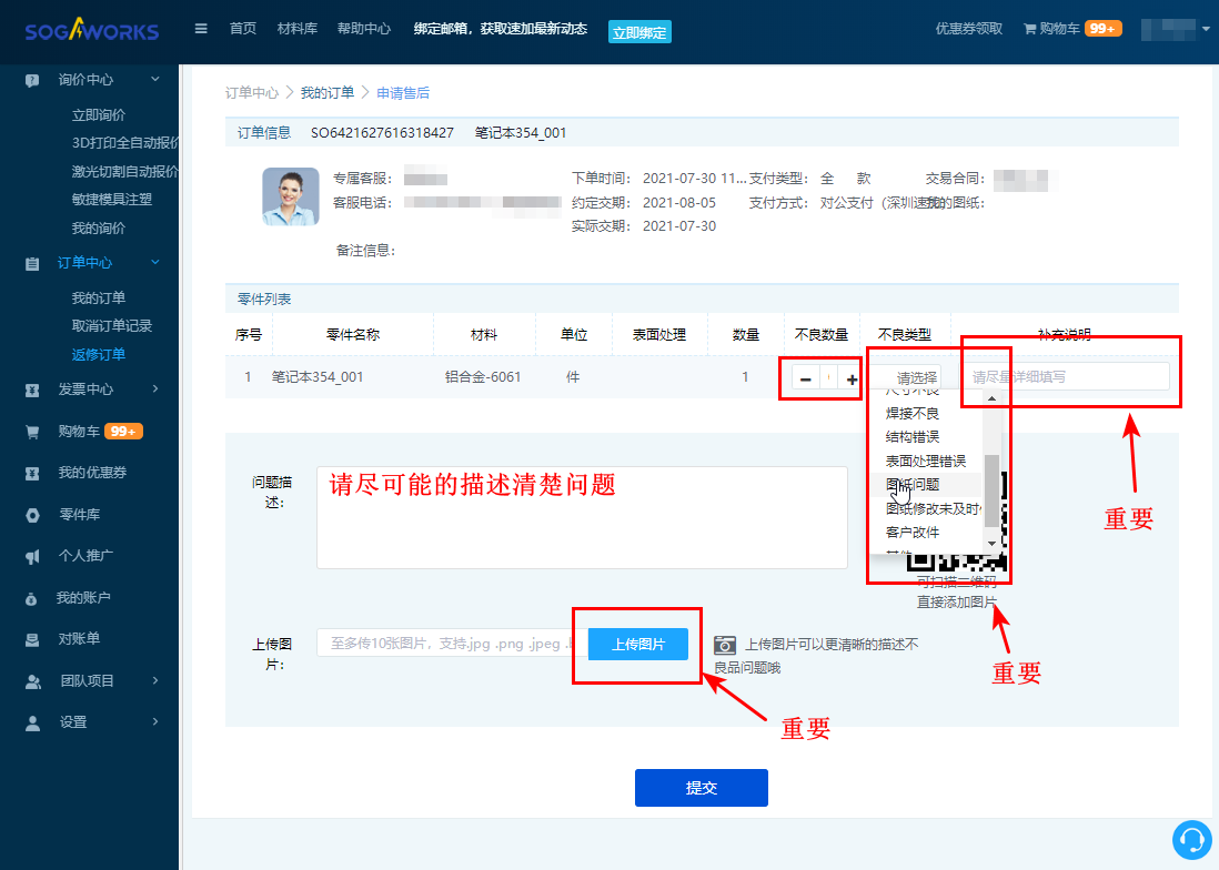 原則上,因加工導致零件有質量問題需要返修,應及時向速加反饋相關問題,并在線提交返修申請;若超過14天未反饋任何質量問題,則視為默認零件合格。